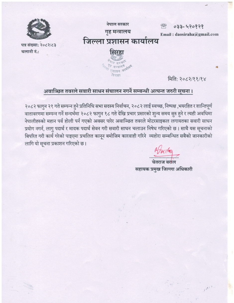 जिल्ला प्रशासन कार्यालय सिरहाद्वारा जारि गरिएको सूचना ।