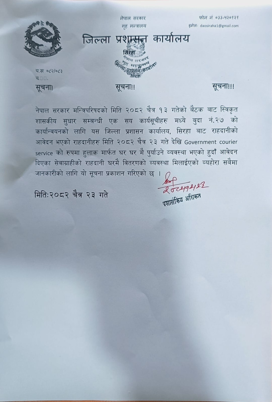 जिल्ला प्रशासन कार्यालय सिरहाद्वारा जारि गरिएको सूचना ।
