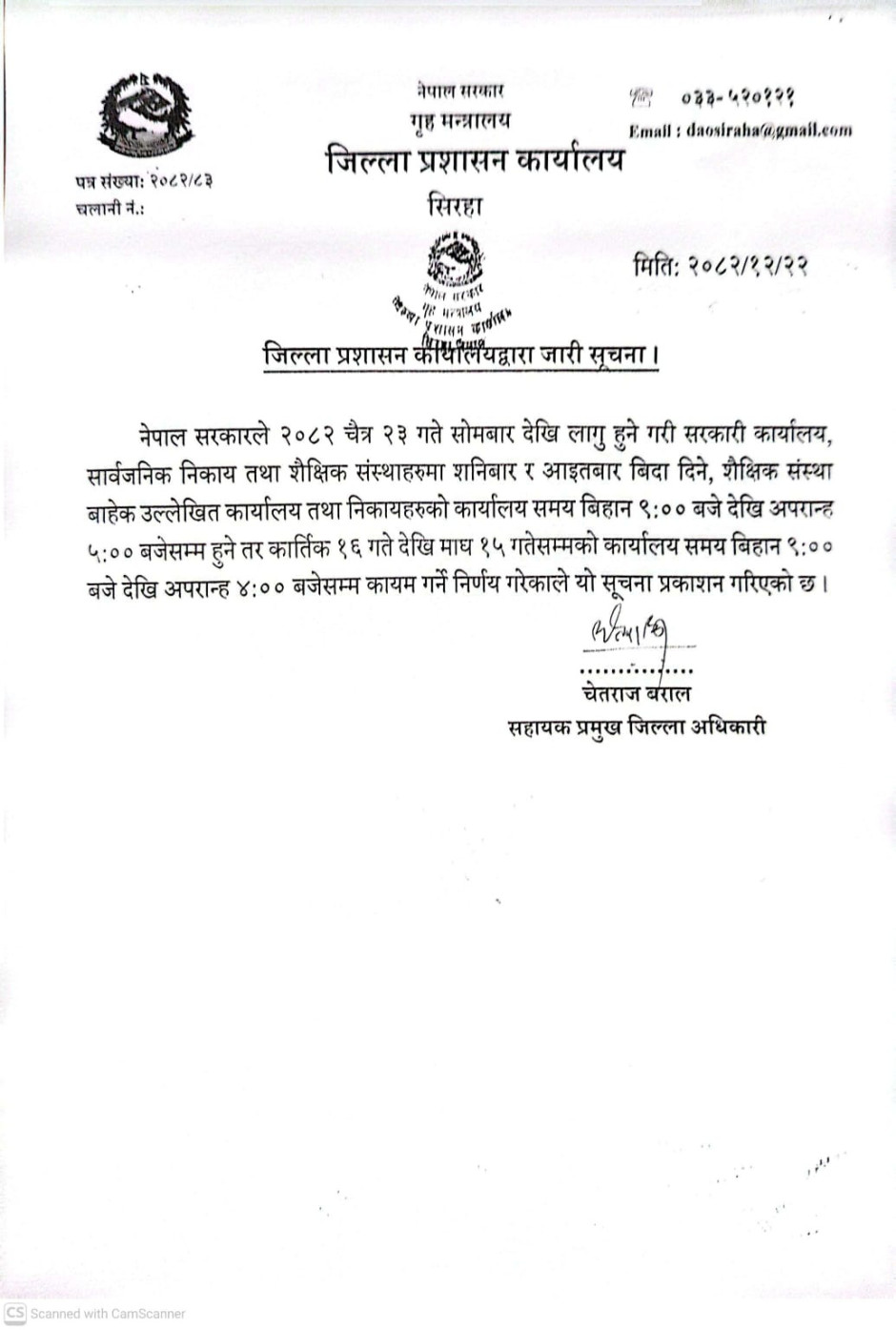 जिल्ला प्रशासन कार्यालय सिरहाद्वारा जारि गरिएको सूचना ।
