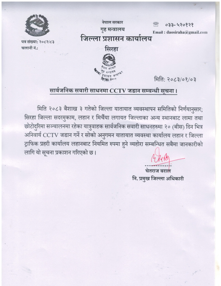 जिल्ला प्रशासन कार्यालय सिरहाद्वारा जारि गरिएको सूचना ।
