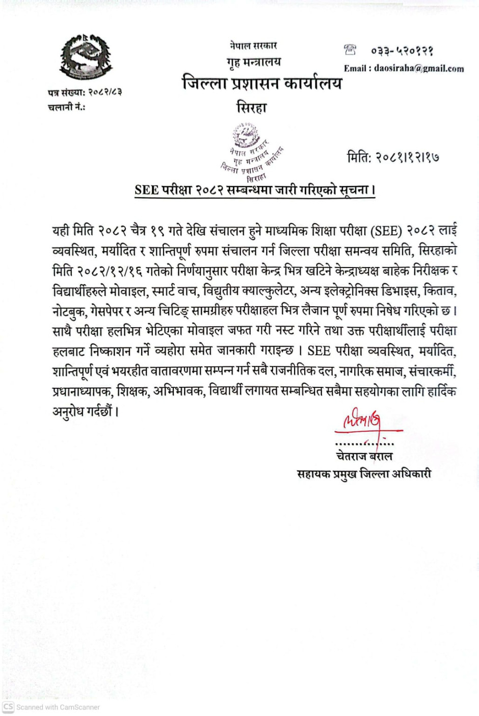 जिल्ला प्रशासन कार्यालय सिरहाद्वारा जारि गरिएको सूचना ।